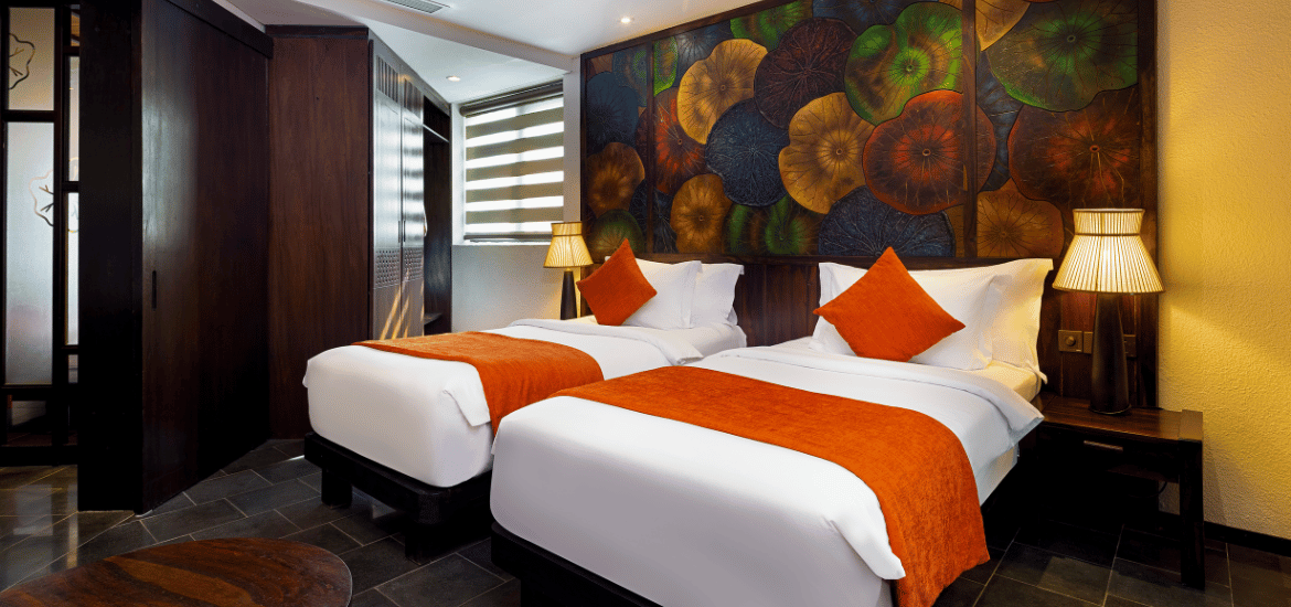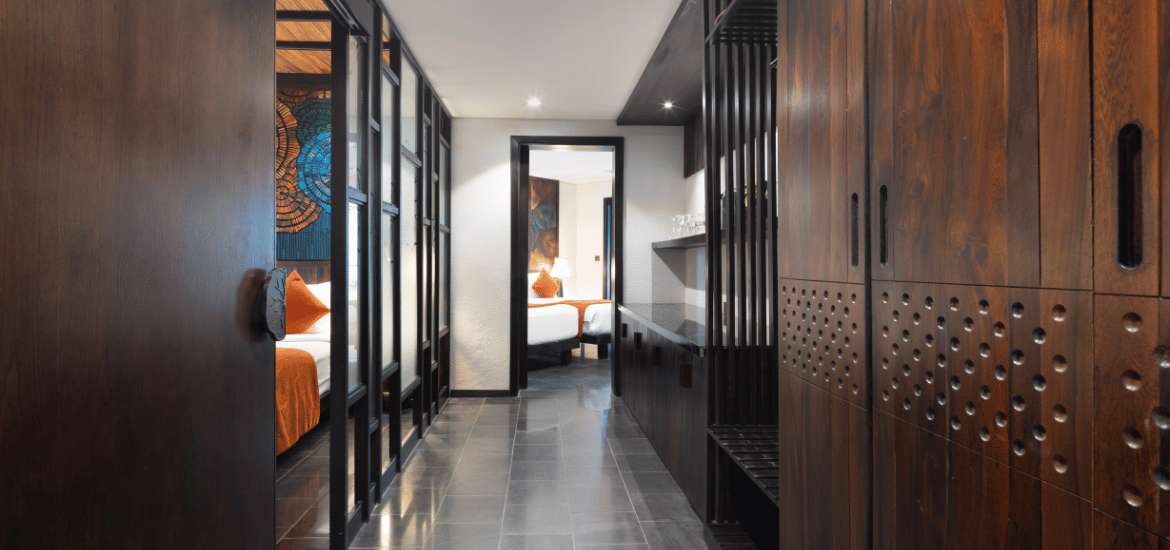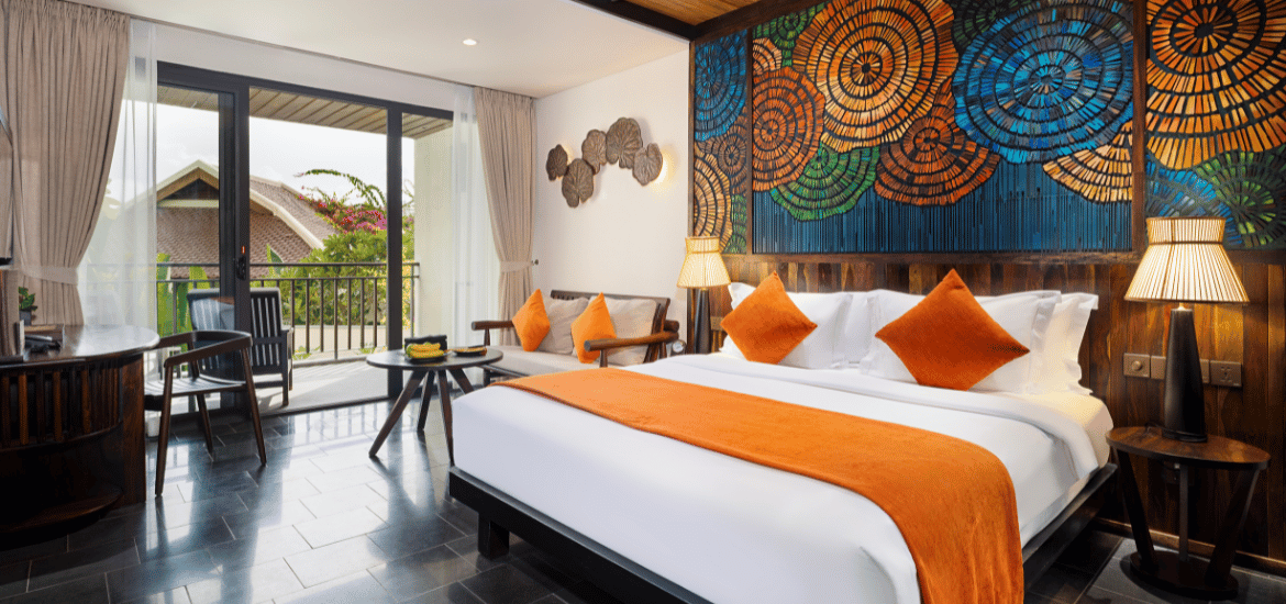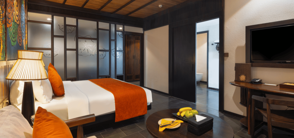 Overlooking lush gardens, it includes modern amenities, private balcony, and bathroom with a hand-carved stone bathtub with Rain shower. Perfect for family getaways, enjoy the kids’ club and tailored resort activities for all ages.