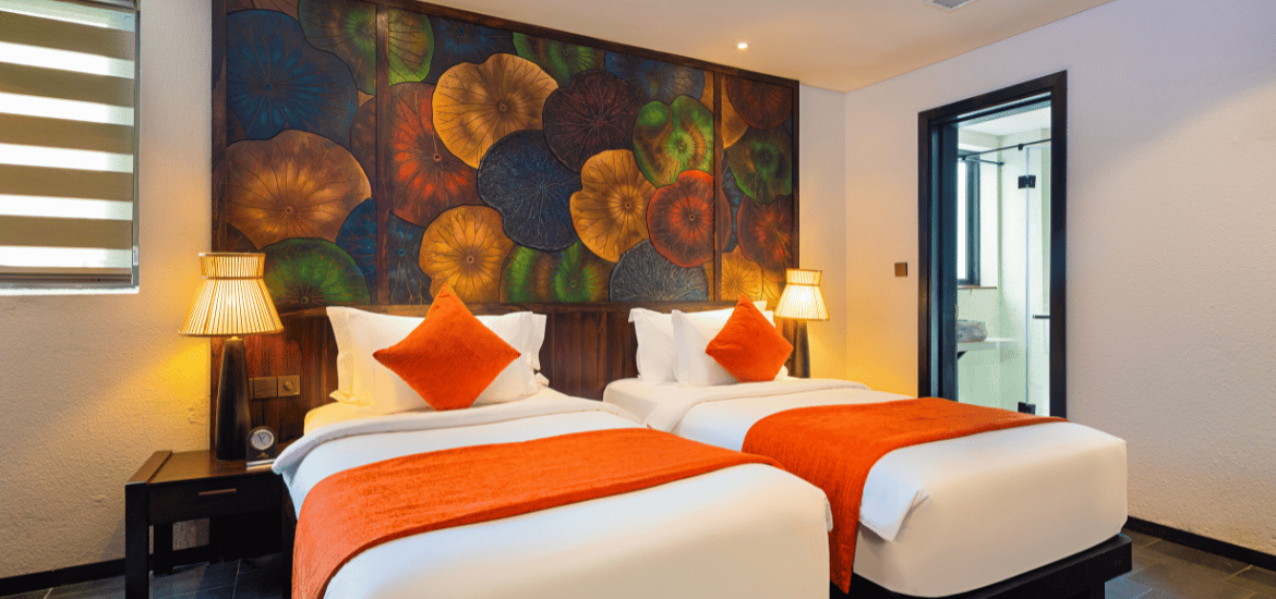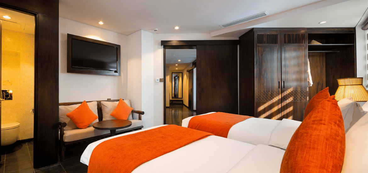 Ideal for those travelling with family or friends, our Family Villa 2-bedroom Garden View ensure comfort for everyone, featuring two bedrooms with one king size bed and two twin beds, two bathrooms, a kitchen with basic kitchenware and dining facilities.