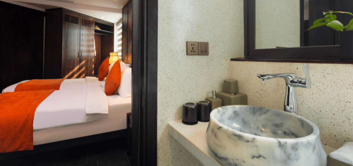Overlooking mountain view, it includes modern amenities, private balcony, and bathroom with a hand-carved stone bathtub with Rain shower. Perfect for family getaways, enjoy the kids’ club and tailored resort activities for all ages.