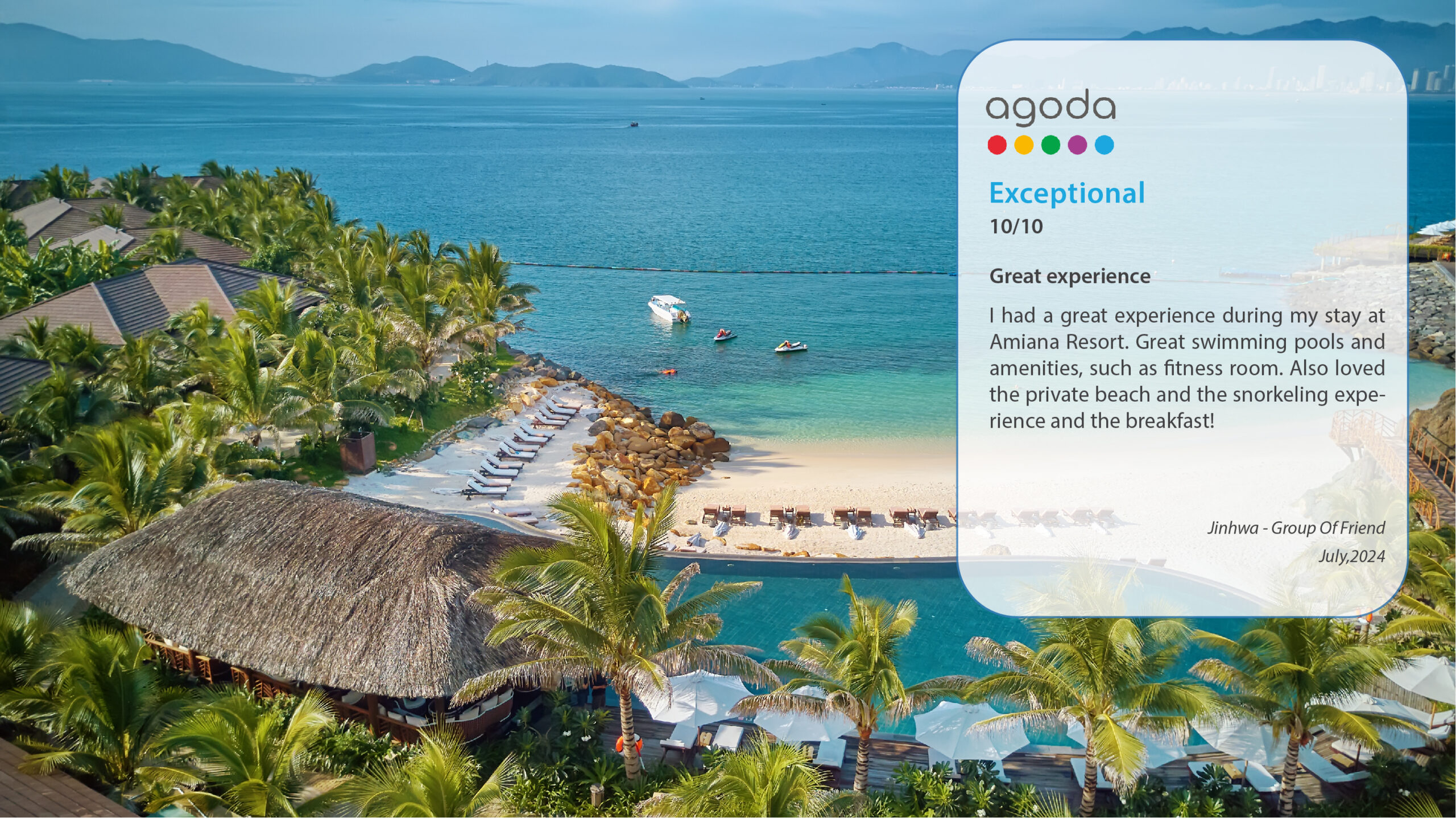 Amiana Resort Nha Trang is grateful for the support from its valued guests, which has contributed to its continued success. We extend our heartfelt gratitude to all guests who have taken the time to share their feedback. Your reviews not only help us celebrate the best in hospitality but also guide potential visitors in making perfect decisions about their stay.