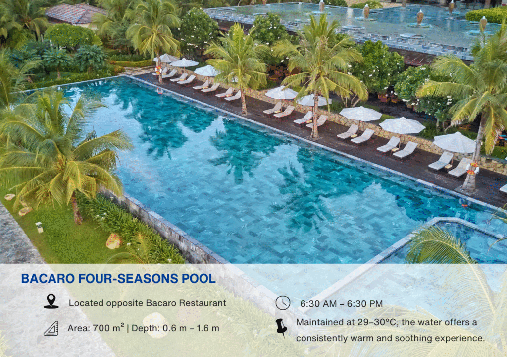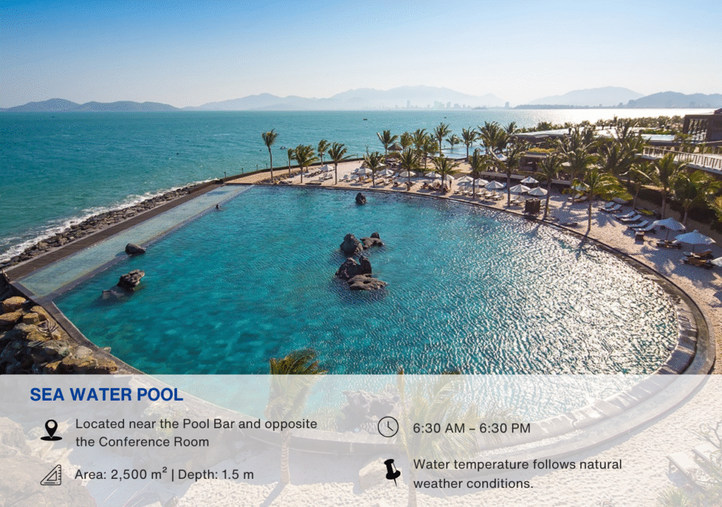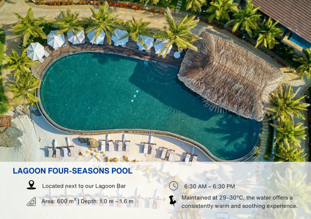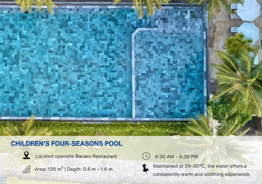 With a commitment to offering exceptional moments of relaxation, the freshwater and kids’ pools at Amiana Resort Nha Trang have been upgraded into a Four-Season Pool System, equipped with advanced temperature-control technology. The water is consistently maintained at 29–30°C, ensuring a warm and soothing experience at any time of the day, especially during the cool year-end season.